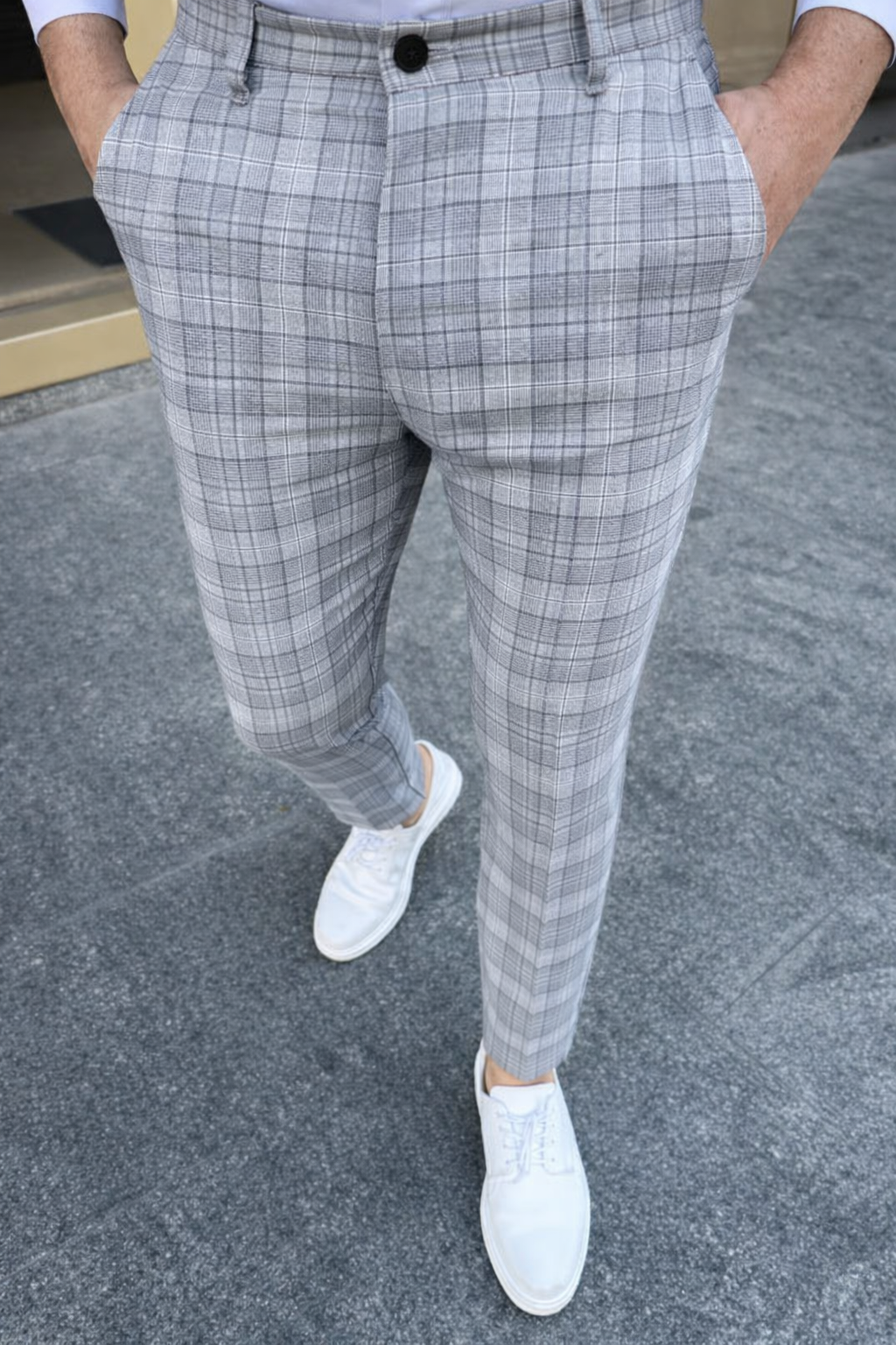 Ce pantalon slim à carreaux gris clair apporte finesse et distinction grâce à son motif discret et structuré.